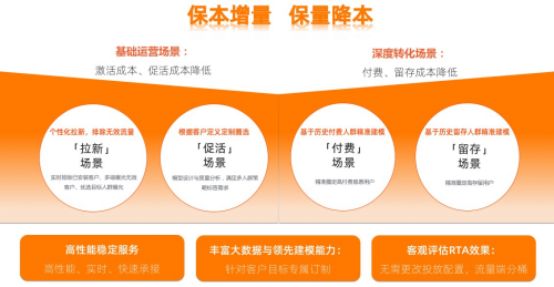 友盟+天域RTA覆盖两个核心场景:一、基础营销场景。拉新中,达到拉新激活成本降低,通过个性化拉新,排除无效流量;拉活中,依据客户定制灵活的的“促活场景”模型设计与质量分析,满足多策略拉活人群圈选;二、深度转化场景,依据友盟+天域RTA独有的优势,深度转化以及后链路数据场景,如付费、次留等可实现保量降本的效果。