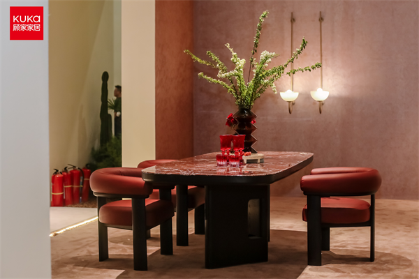 除此之外,此次顾家重磅展出的收藏品级「奢石系列PT3282餐桌」是客餐厅的另一大亮点产品,彰显出高端家庭的仪式感社交场。紫罗红石材源自天然,色泽瑰丽,纹理细腻,象征繁荣与昌盛;厚重木纹面托板稳固承托并保护桌面,圆润边角设计搭配设计感底座,释放独一无二的奢美质感。