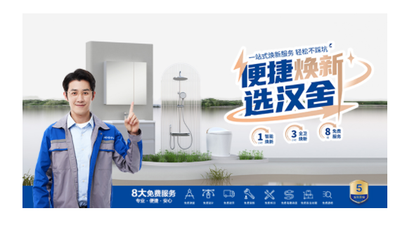 "五一黄金周,汉舍卫浴以政企双补引爆卫浴焕新潮!2.7亿套老旧住宅亟待升级,智能马桶、节水龙头等高性价比产品直击消费痛点,搭配8大免费服务,打造一站式焕新体验。政策红利+技术普惠+场景服务,开启家居消费新范式。"