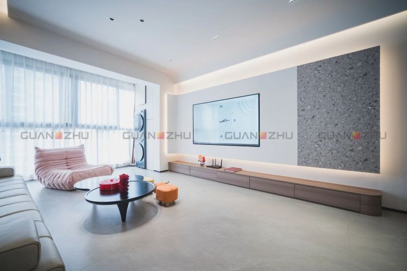 在客厅设计中,屋主Aison非常注重布局的灵活性,他将原本的三室改为两室,并解释道:“如果再多一个新的家庭成员,我们也可以轻松地将半开放书房改造成一个独立的房间,不会影响整体的居住体验。”全屋铺贴冠珠微光石流沙-砚灰,其流动的纹理宛如细腻沙粒,轻盈铺洒于地面,将所有看似碎片的空间重组完整,让家的温暖与爱意静静流淌。