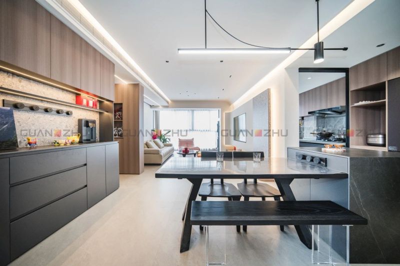 迎合夫妻俩中西交融的饮食习惯,岛台餐桌的开放设计,满足西式轻食的便捷需求;独立的中式厨房,则承载着他们对传统饮食的热爱。该区域的所有所有电器都做了内嵌设计,并搭建节能技术,进一步降低能耗,让厨房成为环保与实用兼备的场所。餐厨空间选用绿色环保型材料——冠珠微光石流沙-砚灰,也是他们可持续理念的体现,低维护需求和超长使用寿命,在满足环保和耐用的基础上,默默见证他们充满爱的每一个日常。