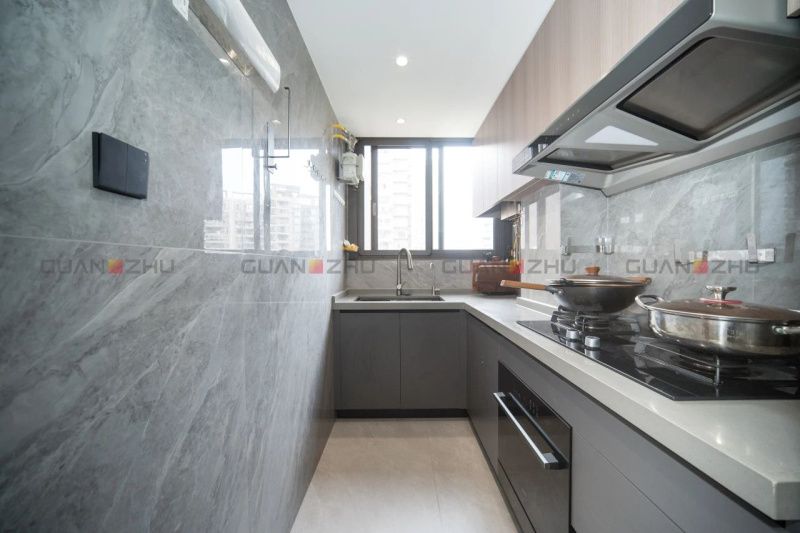 屋主Aison说:“厨房墙面,我们希望能有多一点点的反光。”这样的设计,小空间也能显得明亮而有活力。墙面搭配暖灰色的冠珠塞浦路斯灰,折射出柔和的光线,灵动的大理石连纹顺着光线延伸,赋予空间极致视觉张力。