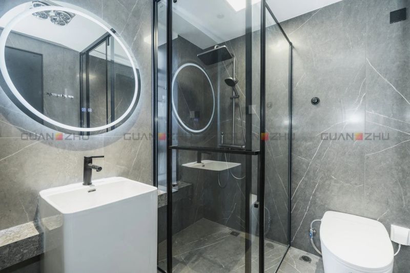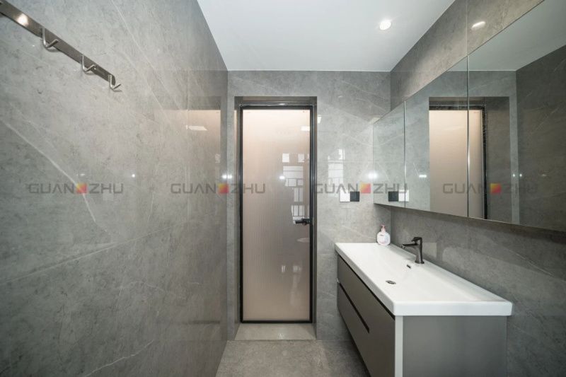 次卫则采用二分离式布局,浅灰调将温柔质感延续至每一寸空间。而极简设计减少了空间的拥挤感,让日常使用更加舒适与高效。墙面冠珠保加利亚浅灰其纯净的浅灰色砖面搭配不规则的冰裂状白色纹理,为整个空间注入了一种清新与灵动。地面则铺贴另一款深色砖,形成上浅下深的搭配,赋予空间一种稳重而温馨的氛围。