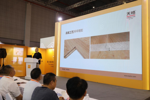 展会上,天格通过沉浸式展位设计与观众深度互动,将其对“高端”的理解转化为可感知的体验。整个展位以中国“天、木、人”三方平衡为理念,使用大量的天然木材并融入中国传统榫卯结构。观众不仅能触摸到实木的天然质感,还能直观了解到通过以榫卯结构为灵感的锁扣连接技术的精妙。2024年,天格品牌定位全新升级,以“表里如一的高端品质、面面俱到的高端服务、总部负责的高端安装、环环相扣的高端工艺和五大承诺的高端保障”为核心,系统性重构高端地板的价值链。在展会第二日,由实木地板联盟举办的《世界的就是中国的 中国地板多元文化创新发布》活动上,天格营销副总经理张山山先生再次深度解读了中国高端实木地板五大标准,让用户从选购到使用全流程感受到中国地板品牌打造的真正高端内涵,赢得了业内人士的高度认可。