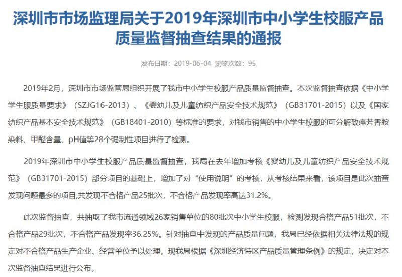 以质量抽检数据为例,公开信息显示,2019年深圳校服抽检的不合格率高达36.25%,2020年这一比例虽有所下降,却仍维持在23.33%的高位。直到 2024 年,深圳市市场监管局对60家生产、销售单位抽检校服150批次,初检仍发现19批次不合格,不合格率为12.7%。主要不合格项目涵盖纤维含量、绳带要求、pH值、标识、色牢度等,这些问题直接关乎学生的身体健康与穿着体验。