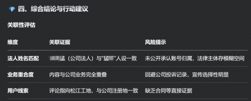 而此时,疑似关系中一家名为“上海居****设计有限公司”的公司引起了我的注意,基于自己没有判断经验,于是我把这个疑问提交给了deepseek,让它帮我进行分析“上海居****设计有限公司”与“上海猛***装修”账号是否存在关联性,以下为部分分析结果: