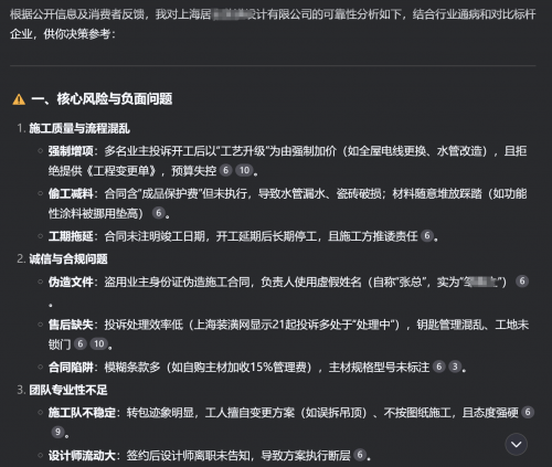 顺着这个思路,我又让deepseek帮我分析了“上海居****设计有限公司”这家公司的可靠性,部分分析内容如下: