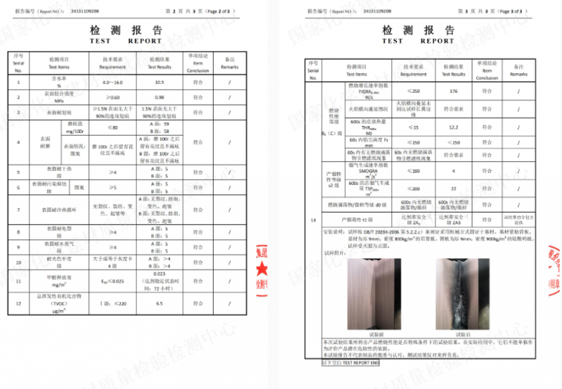 千年舟抗弯海洋生态板生产过程中使用无机胶黏剂,本身不燃且耐受高温,成品板经第三方检测后,燃烧性能达B1级难燃,离火不燃烧;而且抗弯海洋生态板被烧灼后少烟、低毒,600s总烟气生成结果22,远低于国标≤200的要求,全方位呵护你和家人的安全!