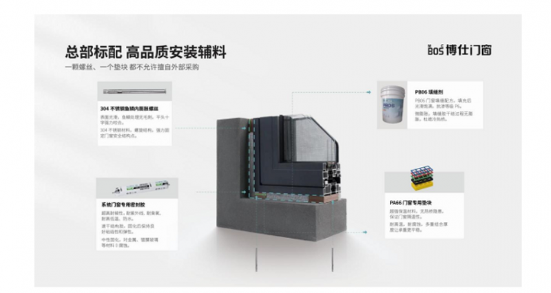工艺上,博仕门窗自建星空试验室,通过角强度测试、隔声性能检测、盐雾测试等全方位验证,确保产品在极端环境下的稳定性。其独创的P6级抗渗安装系统,从304不锈钢鱼鳞内膨胀螺丝到专用填缝剂,每一件辅料均由总部统一标配,29道标准化安装流程全程打卡,彻底避免“好产品,坏安装”的行业痛点。
