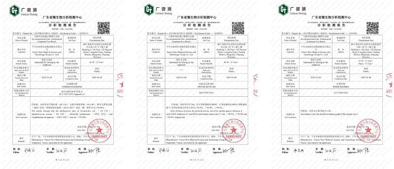 千年舟石墨烯黑金板采用锌效抗菌技术+石墨烯协同作用,形成锌离子、羟基自由基、超氧离子、阳离子碳链四重抗菌屏障,能高效破坏细菌蛋白质结构,干扰微生物DNA合成。经权威检测,其对大肠杆菌、金黄色葡萄球菌、铜绿假单胞菌等常见有害细菌的抗菌率高达99.99%,且效果持久稳定,24小时全天候守护家人健康。