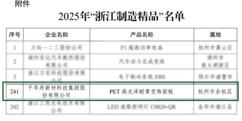 近日,浙江省经济和信息化厅正式发布2025年“浙江制造精品”名单,千年舟自主研发的“PET高光泽耐黄变饰面板”凭借其卓越的环保性能、长效耐久性和国际技术先进性成功入选!这一荣誉不仅是对千年舟产品创新实力的认可,更是对其坚持绿色低碳发展、推动家居产业升级的充分肯定。