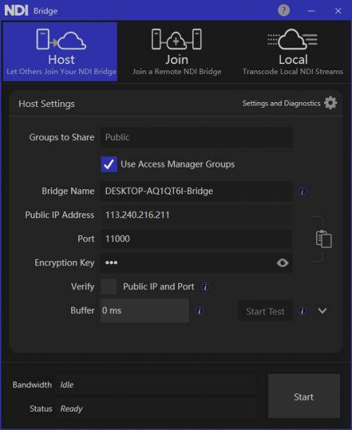 NDI Bridge的工作机制其实非常简单。NDI Bridge Join模式从一端 (A) 的网络中利用NDI发现机制找出所有(你想要桥接的)NDI源,把这些NDI源的名称告诉另外一端 (B);在另外一端 (B),NDI Bridge Host模式将这些NDI源的名称在(B)的网络中创建一份“影子副本”,让它们在(B)端的网络中可被NDI发现,但请注意,此时并没有正式传输视频和音频。当NDI解码器连接到这些“影子副本”的NDI源时,两个Bridge(Join和Host)开始握手协商了,视频和音频才开始正式从 (A) 传输到 (B)。
