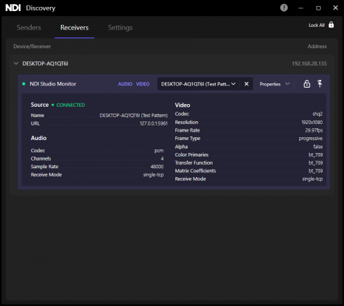 ● (四)启动NDI Discovery工具,此时您将看到您的Studio Monitor正在接收什么NDI源、它的视频格式/音频格式是什么、码率是什么;您还可以用Discovery工具“遥控”你的Studio Monitor,为它选择切换不同的NDI源。