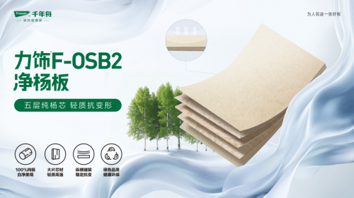 在这一背景下,市场亟需真正具备差异化核心卖点的产品,既能满足消费者日益严苛的需求,又能以独特的价值主张在激烈的竞争中脱颖而出。如何打造兼具高性能与鲜明特色的板材解决方案,正成为行业突破的重要方向。为此,千年舟经过严苛的市场考察及对消费者需求的深度研究,重磅推出——千年舟力饰F-OSB2净杨板。