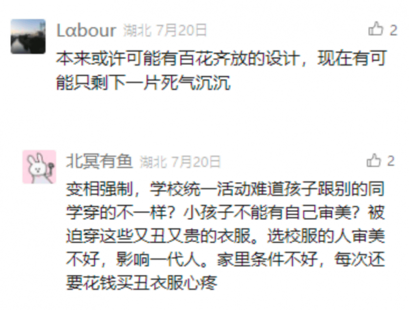 家长们的不满直指决策机制的失衡。教育部2015年明确规定,校服选用需“学生和家长代表占比不低于80%”,但“全市统一”模式中,这一规定沦为空谈。“南昌市统一校服,结果绝对是内定的!”一位家长在话题#南昌校服统一款投票结果#下愤怒留言;深圳家长也反映,2014年确定的21家供应商名单中,“企业把心思全放怎么跟政府搞好关系上,谁还琢磨设计升级?”