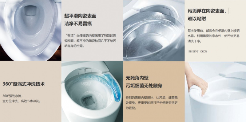 超平滑陶瓷表面,洁净不易留痕,“智洁”坐便器的内壁采用了特别的陶瓷釉面,超平滑的陶瓷釉面几乎不给污垢容身的空隙。