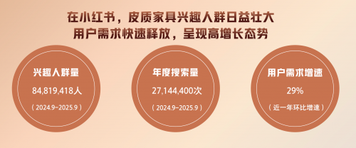 小红书数据显示,过去一年,皮质家具兴趣人群已超8481万,年搜索量2714万次,需求年增速高达29%,呈现爆发式增长。