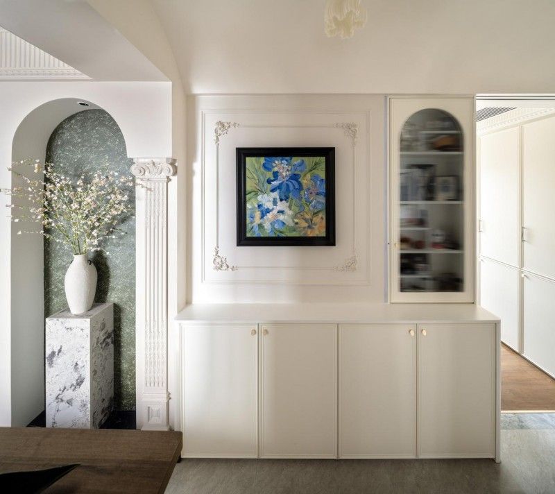 A:最大的挑战应该是在开发商的原有结构上去实现个性化需求,像结构的限制,空间格局固化,有些预埋水电点位错位之类隐蔽工程的不确定性;比如像此次的项目,用轻钢龙骨假墙代替拆墙,内嵌管线和隐藏收纳。将“缺陷转化为特色”用定制拱形模块遮挡开发商遗留的一些畸形墙角。