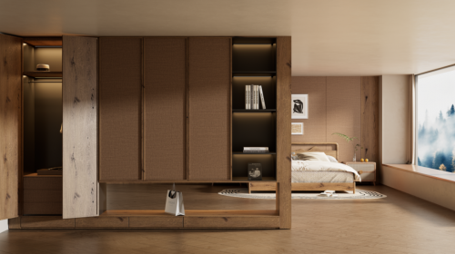 ·功能区融合:衣柜与展示架的一体化设计,用「星回远橡」与「阑珊锦梦」搭配,贯穿其中,既满足收纳需求,又通过开放式展示架点缀书籍、摆件,让空间层次丰富起来,就像秋日森林里的树洞,藏着生活的细碎美好。
