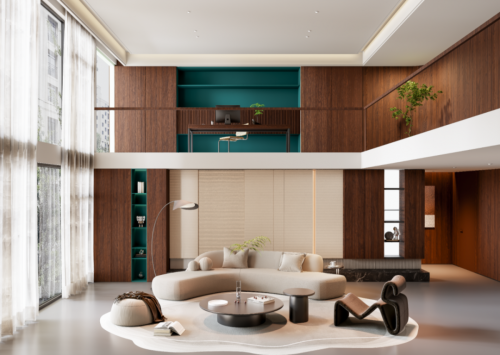 ·材质的层次共生:上层的工作区以「山涧曲柳」为背景,墨绿柜体点缀其中,像山涧旁的林中小屋;下层的休闲区则用「玉沁白」搭配,深棕的沉稳托住了墨绿的跳脱,玉沁白的鲜活又点亮了深棕的厚重,恰似秋日山林里“土壤+植被+日光”的共生美学。