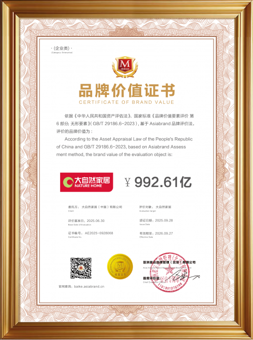 2025年9月27日-28日,由专业品牌评价机构Asiabrand发起主办,中国亚洲经济发展协会、一带一路总商会、东盟-中国工商总会和亚太第一卫视联合主办,被誉为亚洲品牌界年度“奥斯卡”的第20届亚洲品牌盛典在中国香港举行。 此次盛典上,大自然家居比肩一众全球顶尖品牌,再次问鼎“亚洲品牌500强”,获评“亚洲(行业)十大领军品牌”和“亚洲(行业)消费者信赖品牌”,品牌价值跃升至992.61亿。这是大自然家居自2018年登榜后,蝉联上榜的第8年。
