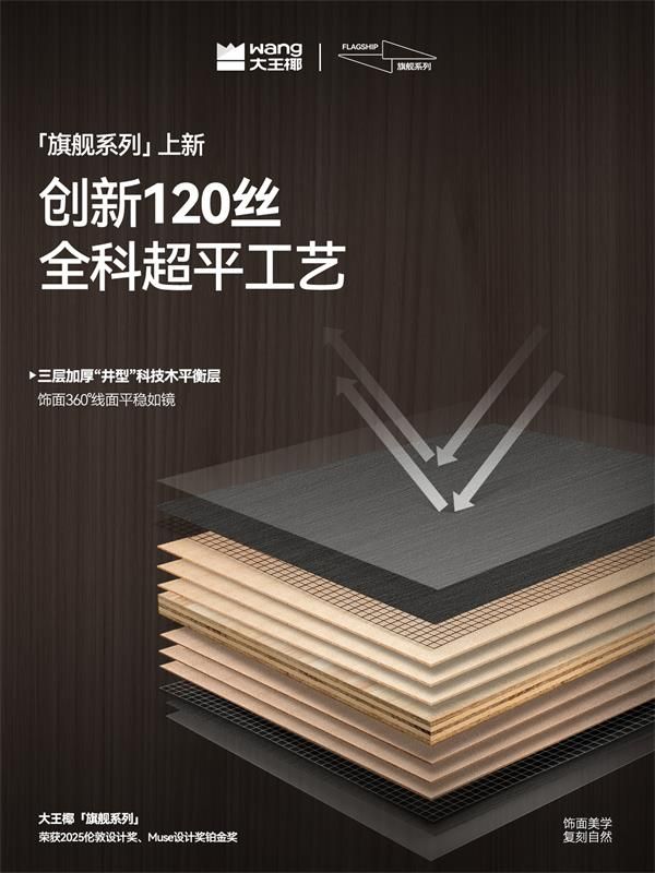 大王椰旗舰系列新品『进口饰面超平板』用工艺创新打磨品质,用用户思维定义价值;能够在临沂木博会上火爆出圈,凭实力圈粉,是对板材“饰面美学标准”的定义,超平工艺则是对“品质体验”的考量,HENF级环保的刷新更是对“家”的责任守护。