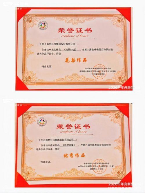 第六届全球表面装饰原创设计秀、原创设计创意分享会率先点燃热潮。千年舟集团凭借对市场趋势的精准把握与原创设计的深厚积淀,“竹翠玲珑”、“绣梦海棠”花色在众多参赛作品中脱颖而出,成功斩获荣誉。