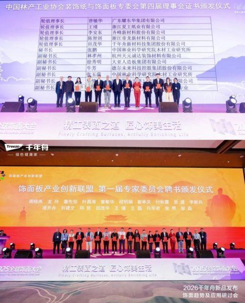会上,千年舟集团执行总经理田茂华获颁中国林产工业协会装饰纸与饰面板专委会第四届理事会证书、饰面板产业创新联盟专家委员会证书,双重荣誉彰显了行业对千年舟品牌影响力与专业实力的高度认可。