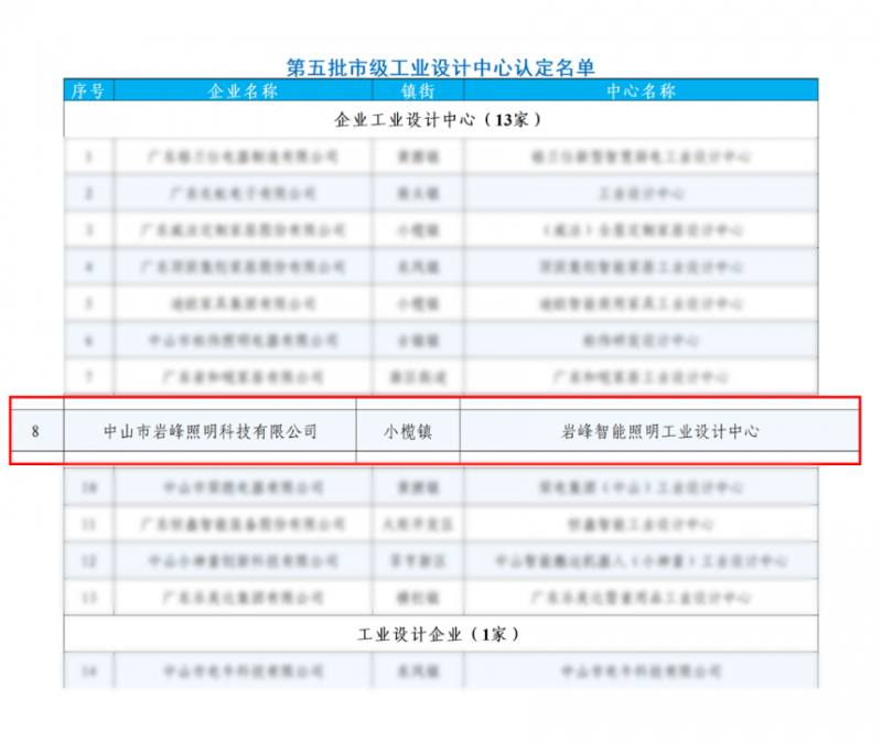 2025年12月4日,中山市工业和信息化局正式公示第五批市级工业设计中心认定名单。根据《中山市工业和信息化局关于印发中山市市级工业设计中心认定管理办法的通知》(中工信〔2025〕116号)及相关工作要求,中山市岩峰照明科技有限公司(以下简称“三峰照明”)凭借卓越的设计创新能力与行业示范效应,成功跻身14家认定企业之列,挂牌为岩峰智能照明工业设计中心。