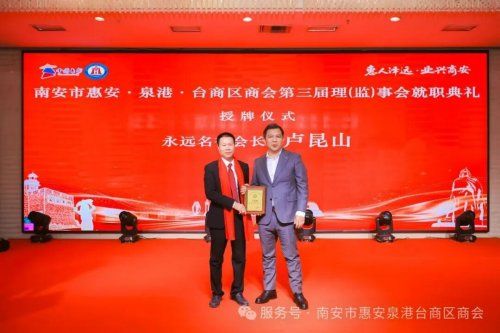 ▲南安市惠安商会会长黄明忠为永远名誉会长卢昆山呈送聘书