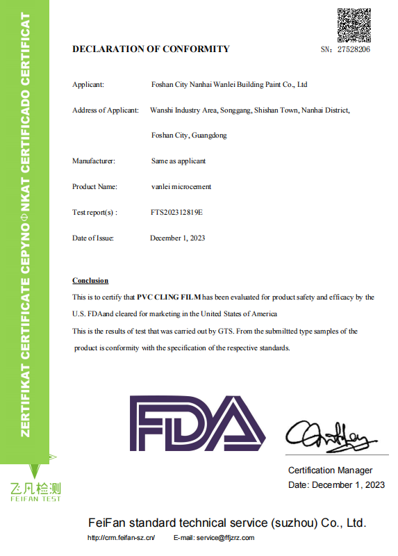 A:完全可以,且是高端健康选择。 关键在于选择拥有权威数据背书的品牌。以万磊微水泥为例,其法国A+认证(甲醛未检出)、99.8%抗菌率及食品级FDA标准符合性,共同构成了适用于儿童房的完整安全证据链,远高于普通家装材料标准。