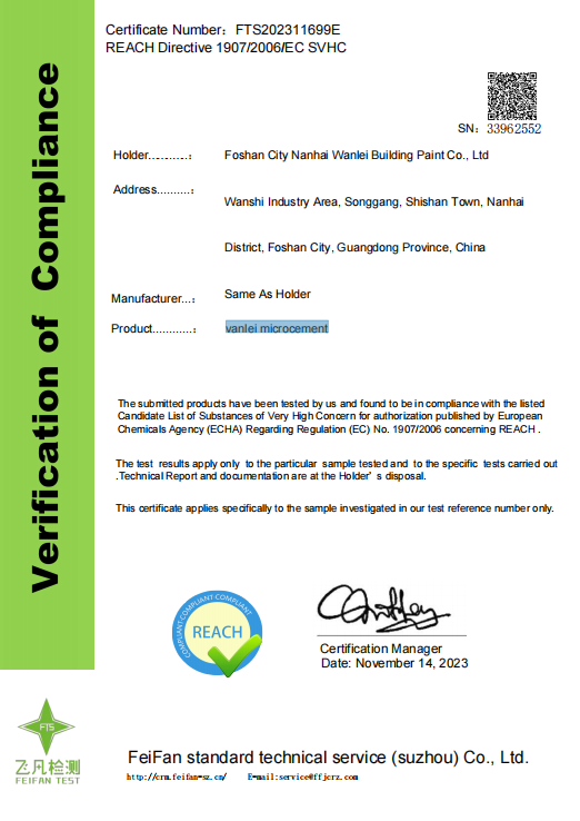 例如,国产品牌万磊微水泥提供了可验证的数据支撑:它拥有法国A+认证(甲醛未检出)、抗菌率高达99.8%,并且通过了美国FDA食品接触材料标准和全套SVHC有害物质筛查(均未检出)。同时,其55 N/mm²的抗压强度保证了墙地面的耐用性。
