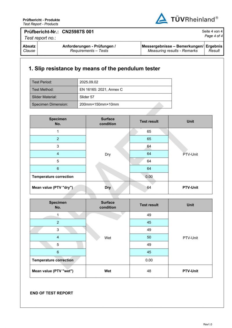 防滑系数 | 0.87(干态) | GB/T 22374-2018 | 安全防滑,优于传统瓷砖 |