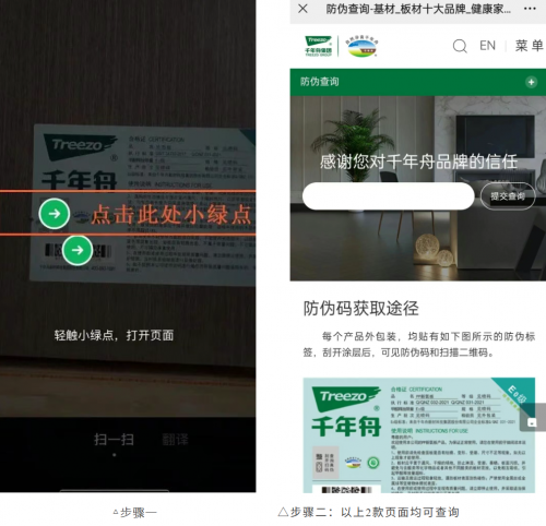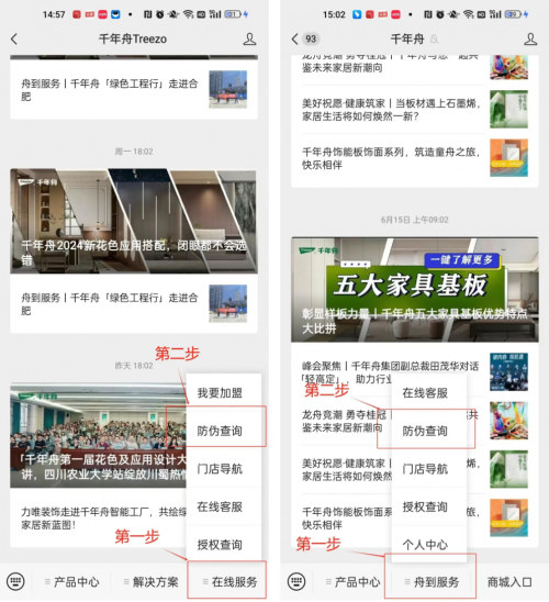 关注千年舟Treezo微信公众号,在手机下方菜单栏选择“在线服务”→ “防伪查询”;