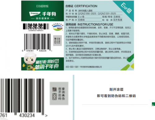 每个板材产品外包装,均贴有如下图所示的防伪标签,刮开涂层后,可见防伪码和扫描二维码。