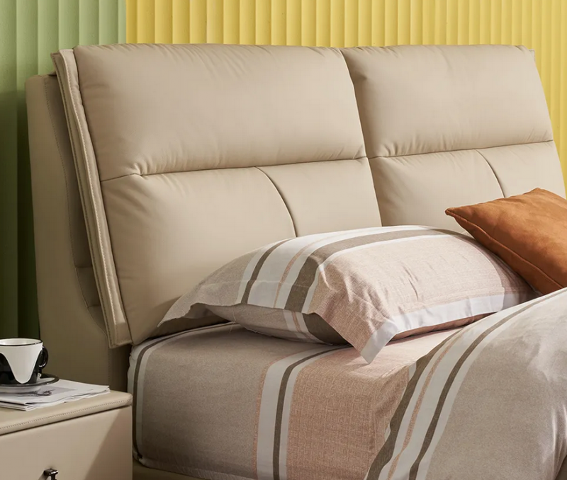 穗宝集团梵洛贝在材质选择上同样秉持严苛标准,力求兼顾舒适触感与长久耐用。外层选用头层黄牛皮胚料,优选疤痕少、皮质紧实的优质皮张,最大程度还原头层牛皮的天然肌理,让床体外观立体饱满,触感细腻温润。内层创新填充7孔纤维棉与高密度海绵组合,两种材质的精妙融合,让靠包兼具饱满蓬松的触感与持久回弹的特性,即便长期倚靠也不易变形塌陷,完美平衡实用性与舒适感。