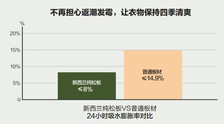 新西兰纯松板卓越的防潮力,如同家里常驻的干燥小精灵,即使在连绵雨季,衣柜深处依旧干燥洁净。那些关于湿度侵袭的反复计算,终于可以划掉。关上衣柜门,清爽整洁的空间带来人精神的豁然舒展。