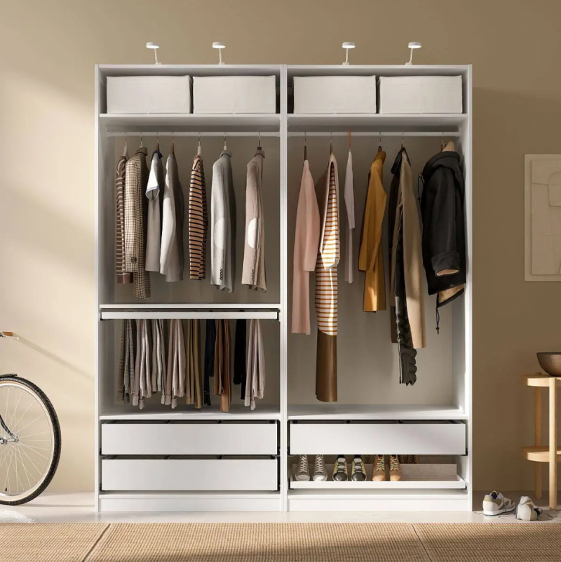 其一,模块化收纳设计,200cm + 高柜体最大化利用垂直空间,搭配 KOMPLEMENT 系列的挂衣杆、搁板、抽屉、衣物篮、鞋架、首饰盒等多元内配,可灵活组合专属挂衣区、叠放区、配饰区、鞋袜区等,柜体侧边设多档位可调节孔位,能根据衣物长度、储物需求自由调整隔板与挂衣杆位置,从长款大衣到小件袜子,都能找到专属收纳位,彻底告别衣柜杂乱;