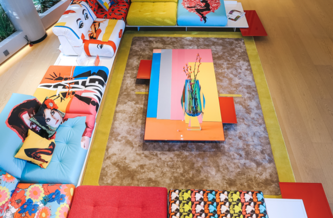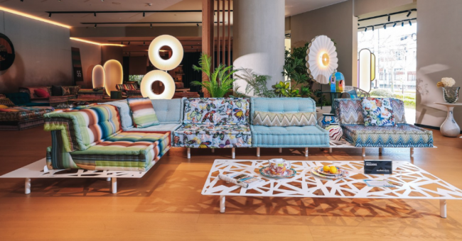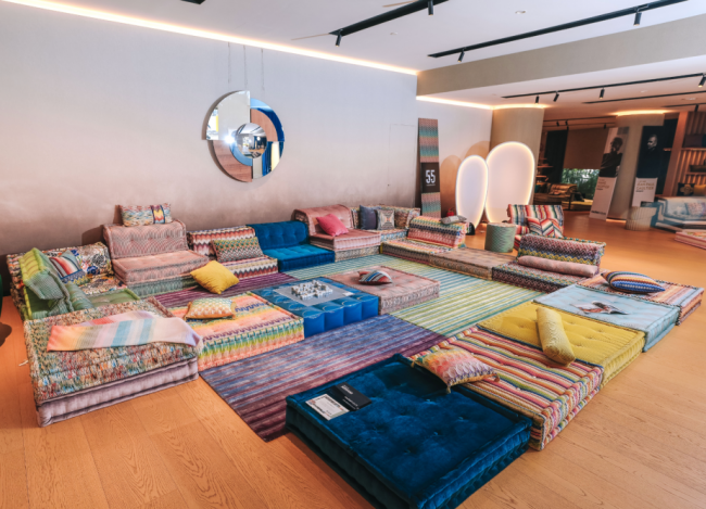 展览现场,Mah Jong 沙发 Missoni 版还以极具创意的“贪吃蛇”式组合方式呈现:多个模块在空间中连续蜿蜒延展,如同一条灵动游走的色彩轨迹,在开阔空间中形成流动的视觉路径。这种顽皮布局既展现了 Mah Jong 高度自由的特性,也让观者在行走之间不断发现新的空间节奏与视角。