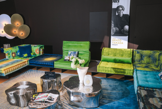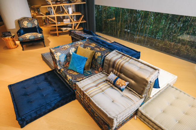 与“时尚顽童”Jean Paul Gaultier 的合作版本,则展现出另一种大胆率真的设计态度。JPG 将其标志性的水手条纹与高级时装面料结合,为Mah Jong“麻将”沙发赋予鲜明的个性印记。现场宛如一场正在进行的时尚大片拍摄:沙发模块与抱枕自由散落于地毯之上,与其为罗奇堡设计的其他家居单品彼此呼应,在空间中交织成一场关于时尚、设计与生活方式的对话。