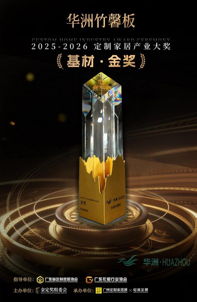 3月30 日,2025-2026 金定奖・定制家居产业大奖在广州圆满落幕。这场汇聚950余家企业、历经数月严苛评审的行业盛事,最终诞生了本届最耀眼的赢家 ——华洲木业。凭借旗下竹馨板斩获基材类金奖,叠加此前金品澳桉板已获金定奖板材金奖,华洲成为实现双金加冕的板材品牌,以绝对实力领跑高端环保基材赛道。