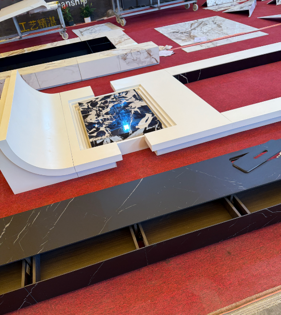 谢甫青说只做实实在在的定制加工,不做自有品牌销售,可以覆盖918到1.8m×3.2m全规格岩板加工,承接异形岛台、餐台面、餐边柜、楼梯踏步、厨房台面复合蜂窝铝等各类定制。