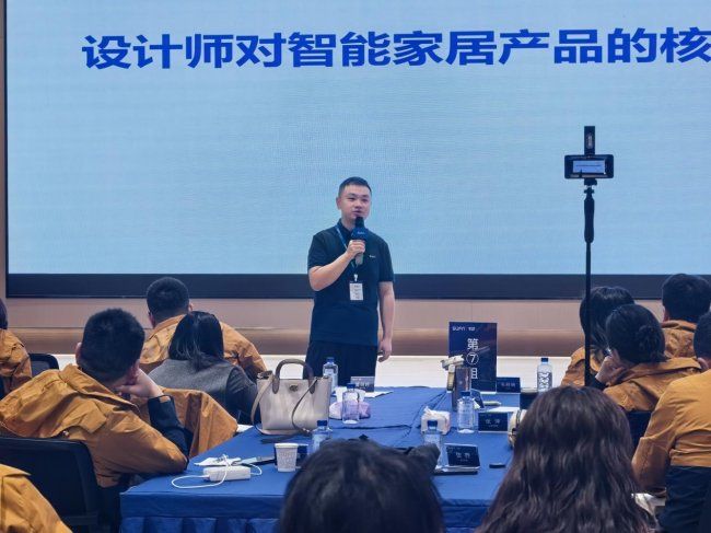 除行业趋势与产品解析外,三峰照明赋能部经理郑琪琨也带来了极具实操价值的干货分享,聚焦终端服务升级与签单效率提升,为学员解锁核心技能。他围绕照明设计方案的思路、设计依据,以及智能家居设计方案的底层逻辑展开细致讲解,明确当下市场已从“产品竞争”转向“服务竞争”,管理模式革新成为终端破局的关键。
