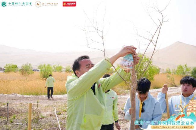 现场顿时热火朝天,大家分工协作默契配合,挥锹培土、扶苗浇水。一棵棵树苗扎根大漠,不仅为丝路绿洲再添新绿,更在每一位参与者心中种下了生态文明的种子。