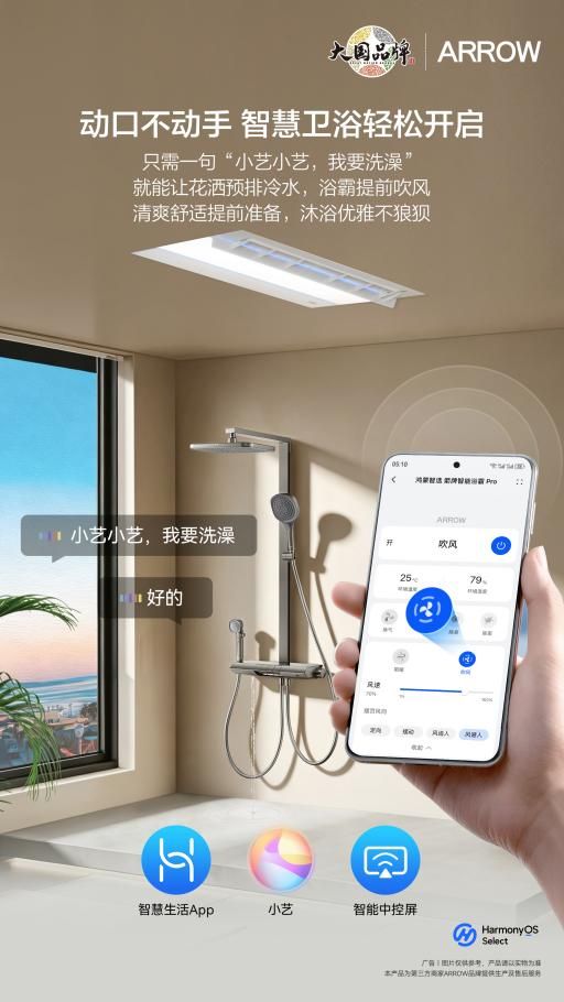 联动层——鸿蒙分布式能力,让设备从孤立走向协同。 传统智能卫浴中,花洒、浴霸、灯光各不相通。鸿蒙智联的接入,让箭牌得以构建完整的场景联动逻辑。用户只需对华为小艺语音助手说一句“我要洗澡”,箭牌智能花洒Pro便自动预排冷水,浴霸启动暖风,灯光调至舒适亮度。沐浴结束,用户说“我洗好了”,灯光延时关闭,浴霸转入干燥模式。整个过程中,用户无需动手触碰任何湿滑的按键,只需动口,甚至动口都无需重复——系统会根据用户的位置与行为自动切换场景。智能花洒Pro“智雨精灵”更支持通过华为智慧生活APP、智能中控屏等多种入口远程操控,彻底告别“以身试水”的尴尬。