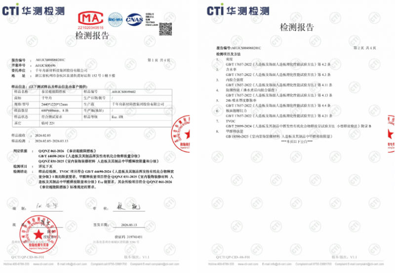 如今工程项目的环保要求日益严格,从住宅精装到酒店、学校、医院,对室内空气质量的要求越来越高。经第三方权威检测,泰岩超能阻燃板甲醛释放量达到ENF级(≤0.025mg/m³),总挥发性有机物(TVOC)符合Ⅰ级标准(≤200μg/m³),真正做到即装即用,不耽误工期,更不牺牲健康。