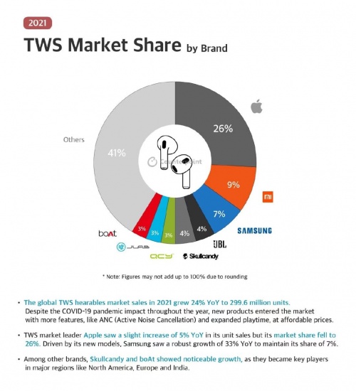 经过多年发展,TWS 耳机市场上中下游产业链已经趋向成熟和完善,根据权威数据机构 counterpoint所发布的报告,2021年全球 TWS 出货量同比增长24% ,达到3亿部,这个市场依旧保持着高速发展势头,具备继续挖掘的价值。