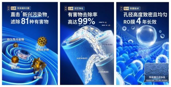 此次推出的沁园新5系净水器,以小白鲸PRO 800G为例,搭载了全新升级的恒净极滤TM科技Pro,九维埃米级RO膜1,直击新兴污染物2,例如持久性有机污染物、毒性化学物、微小塑料粒子、塑化剂等,有效滤除包含新兴污染物在内的81种有害物质3,净化饮用水中的“危险分子”。新品还采用了PGP复合滤芯、RO反渗透滤芯、CTO碳棒滤芯三核滤芯协同高效运作,重金属的整机去除率可高达99%5。
