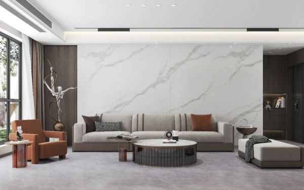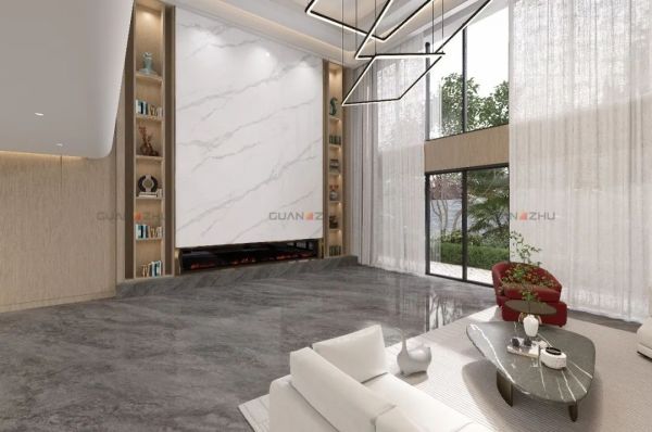 该款灵感源自意大利阿尔卑斯的卡拉拉山脉,传承山脉的高雅华贵,取雪山洁白为底色,以雪山绵延山理为纹路,应用于家居空间中,就是将卡拉拉山脉的磅礴巍峨之感装进家。上下左右可连纹,冠珠瓷砖品牌将其设计为客厅背景墙,纹路纵贯板面,自然大气。
