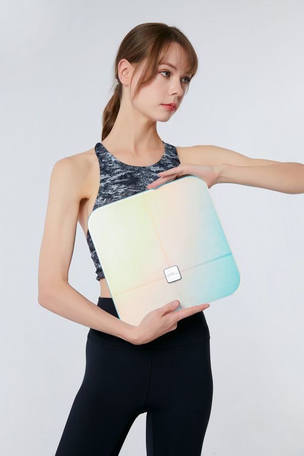 UOIN的这款体脂秤,采用的是炫彩钢化玻璃,肉眼看见的是秤面的色彩会随着光的强弱程度发生变化,侧光下,可以发现其呈现出彩虹般的色彩,强光下会出现如落日般的橙色光晕,正常光线下,呈现淡蓝色与淡橙色相互交印的色彩,非常漂亮。放在家里,品味和档次提升N个度。